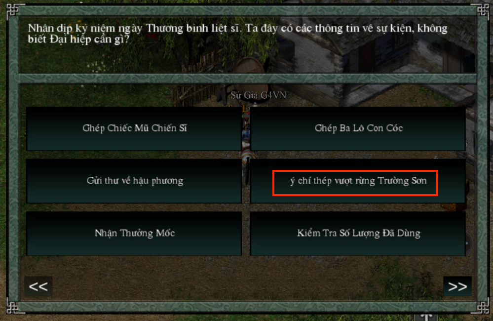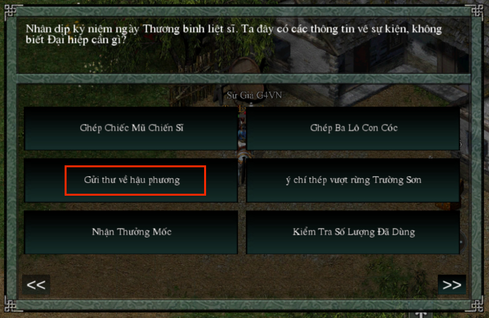 Hãy cùng G4VN tham gia chuỗi sự kiện Nhớ Ơn Anh Hùng Thương Binh - Liệt Sĩ - nơi các đại hiệp cùng dấn bước vào hành trình thu thập và tìm kiếm những vật phẩm đặc biệt rải rác khắp cõi võ lâm, chế tạo ra các vật phẩm kỷ niệm ý nghĩa nhân ngày 27/07 và sử dụng để nhận được các vật phẩm quý giá.