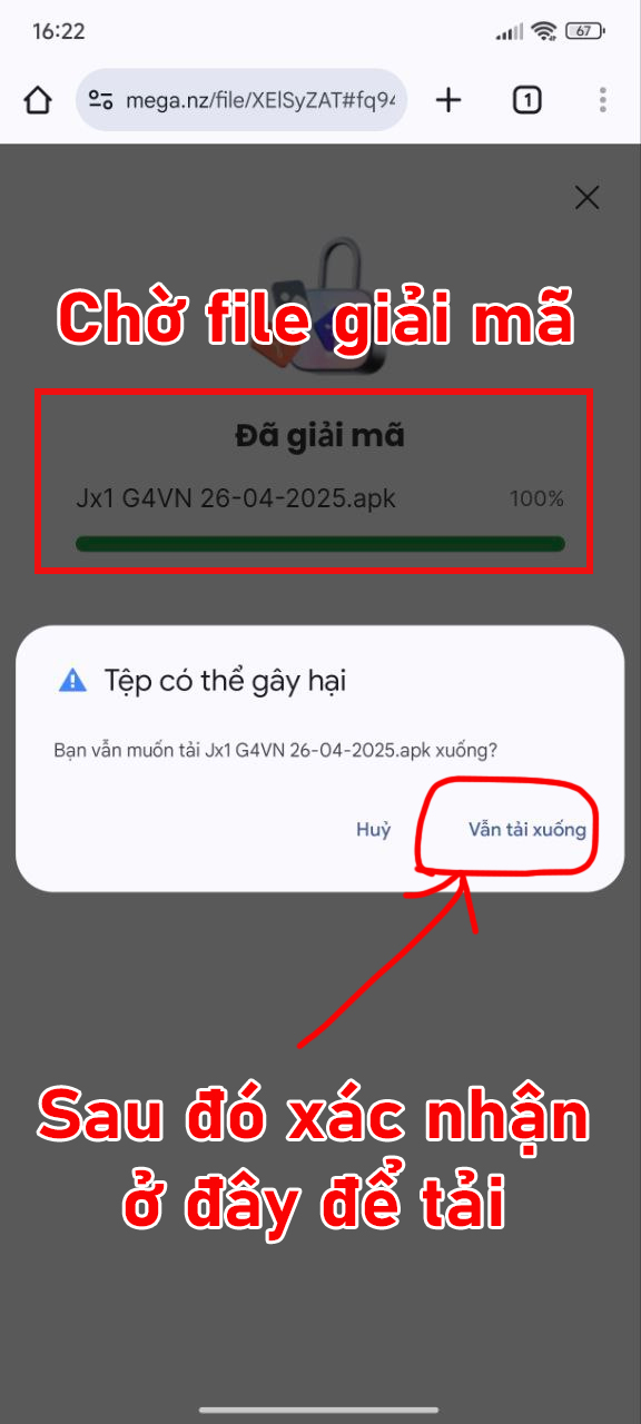 | Bước 2: Khi màn hình đổi sang "Chờ giải mã", vui lòng đợi sau đó bấm vào "Vẫn tải xuống" để xác nhận tải file APK. | ![]() |