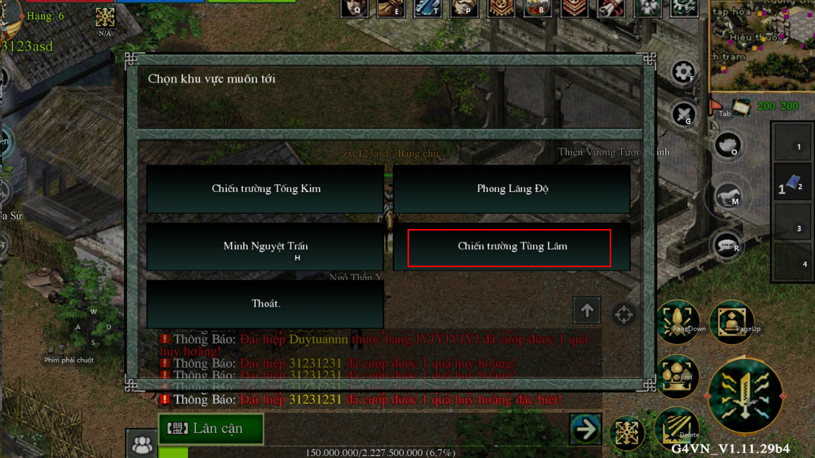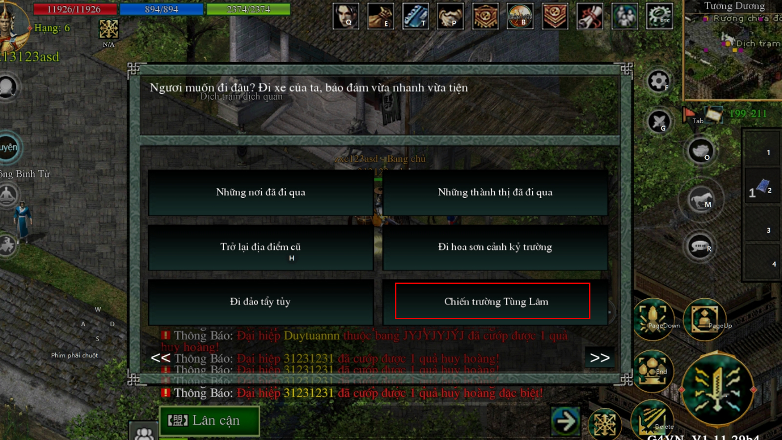 Để tiến vào khu vực Chiến Trường Tùng Lâm, các đại hiệp có thể sử dụng Thần Hành Phù -> chọn Khu Vực Sự Kiện -> chọn Chiến Trường Tùng Lâm hoặc tới NPC Xa Phu ở các thành thị và thực hiện tới Chiến Trường Tùng Lâm.