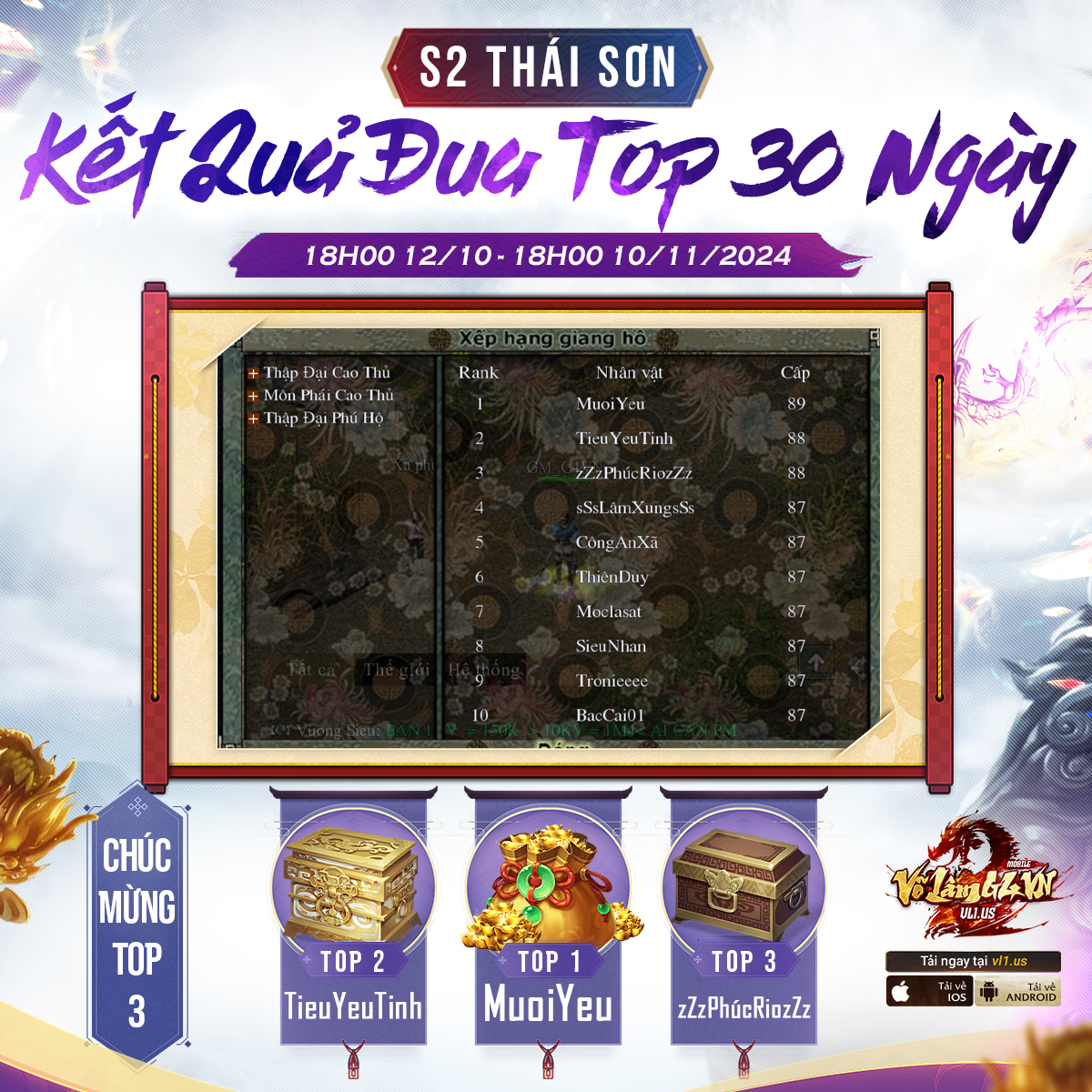 Xin chúc mừng 10 cao thủ kể trên đã xuất sắc giành được thứ hạng của mình. Các đại hiệp có tên vui lòng nhắn tin cho fanpage chính thức để gửi thông tin nhận quà. Kính chúc quý vị cao thủ tiếp tục tu luyện, và hẹn gặp lại trong những sự kiện sau.